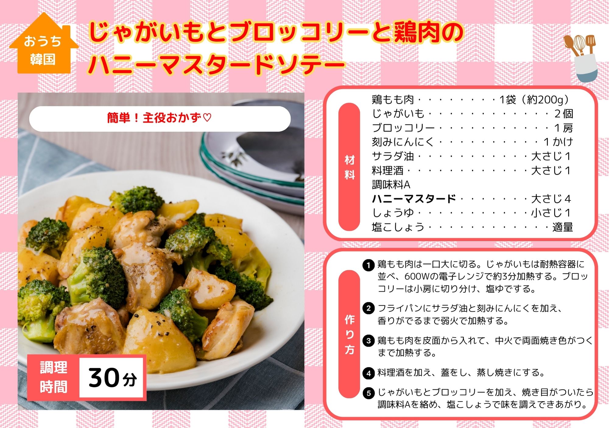 じゃがいもとブロッコリーと鶏肉のハニーマスタードソテー ハニーマスタードで作る簡単主役おかず! レシピを印刷 準備時間 0 minutes mins調理時間 30 minutes mins コース Main Course 分量 2 人前 材料 鶏もも肉 - 1枚(約200g)じゃがいも - 2個ブロッコリー - 1房刻みにんにく - 1かけサラダ油 - 大さじ1調味料Aハニーマスタード - 大さじ4しょうゆ - 小さじ1塩・こしょう - 適量 作り方 鶏もも肉は一口大に切る。じゃがいもは、水にくぐらせ、耐熱容器に並べ、ふんわりラップをしたら600Wの電子レンジで約3分加熱する。ブロッコリーは小房に切り分け、塩ゆでする。フライパンにサラダ油と刻みにんにくを加え、香りがでるまで弱火で加熱する。鶏もも肉を皮面から入れて、中火で焼き色がつくまで加熱する。ひっくり返して反対側にも焼き色をつける。料理酒を加え、蓋をし、蒸し焼きにする。じゃがいもとブロッコリーを加え、軽く焼き目がついたら、調味料Aを加え、全体に絡めて、塩・こしょうで味を調えできあがり。 備考