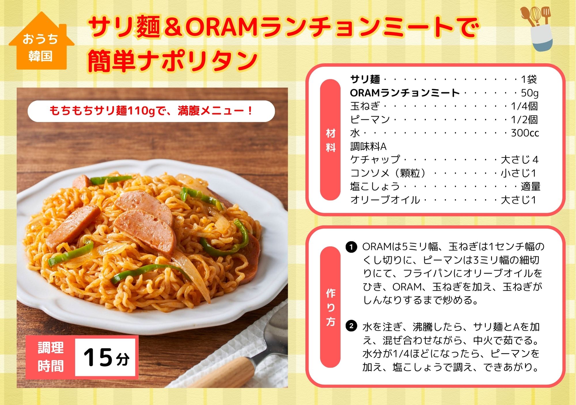 【サリナポ】サリ麵&ORAMランチョンミートで簡単ナポリタン ワンパンで簡単に作れるナポリタンには、たっぷりORAMランチョンミートをIN! レシピを印刷 準備時間 0 minutes mins調理時間 10 minutes mins コース 麺類料理 おうち韓国 分量 2 人前 ※1 材料 サリ麺 - 1袋ORAMランチョンミート - 50g(⅐程度)玉ねぎ - ¼個ピーマン - ½個水 - 300cc塩こしょう - 適量オリーブオイル - 大さじ1調味料Aトマトケチャップ - 大さじ4コンソメ(顆粒) - 小さじ1お好みで粉チーズ - 適量タバスコ - 適量 作り方 ORAMランチョンミートは、5ミリ幅の食べやすい大きさに切る。玉ねぎは1センチ幅のくし切りに、ピーマンは3ミリ幅の細切りにする。熱したフライパンにオリーブオイルをひき、①のORAMランチョンミート、②の玉ねぎを加え、玉ねぎがしんなりするまで炒める。水を注ぎ、沸騰したら、サリ麺と調味料Aを加え、サリ麺をほぐし、全体を混ぜ合わせながら、柔らかくなるまで中火で茹でる水分が¼ほどになったら、ピーマンを加え、塩こしょうで味を調え、できあがり。お好みで、粉チーズやタバスコをかけてお召し上がりください。 備考※1 サリ麺は一般的な日本のインスタント麺に比べて量が多く、1.5人前程度です。 ※2ウィンナーの場合は、2-3本をカットして使用します。