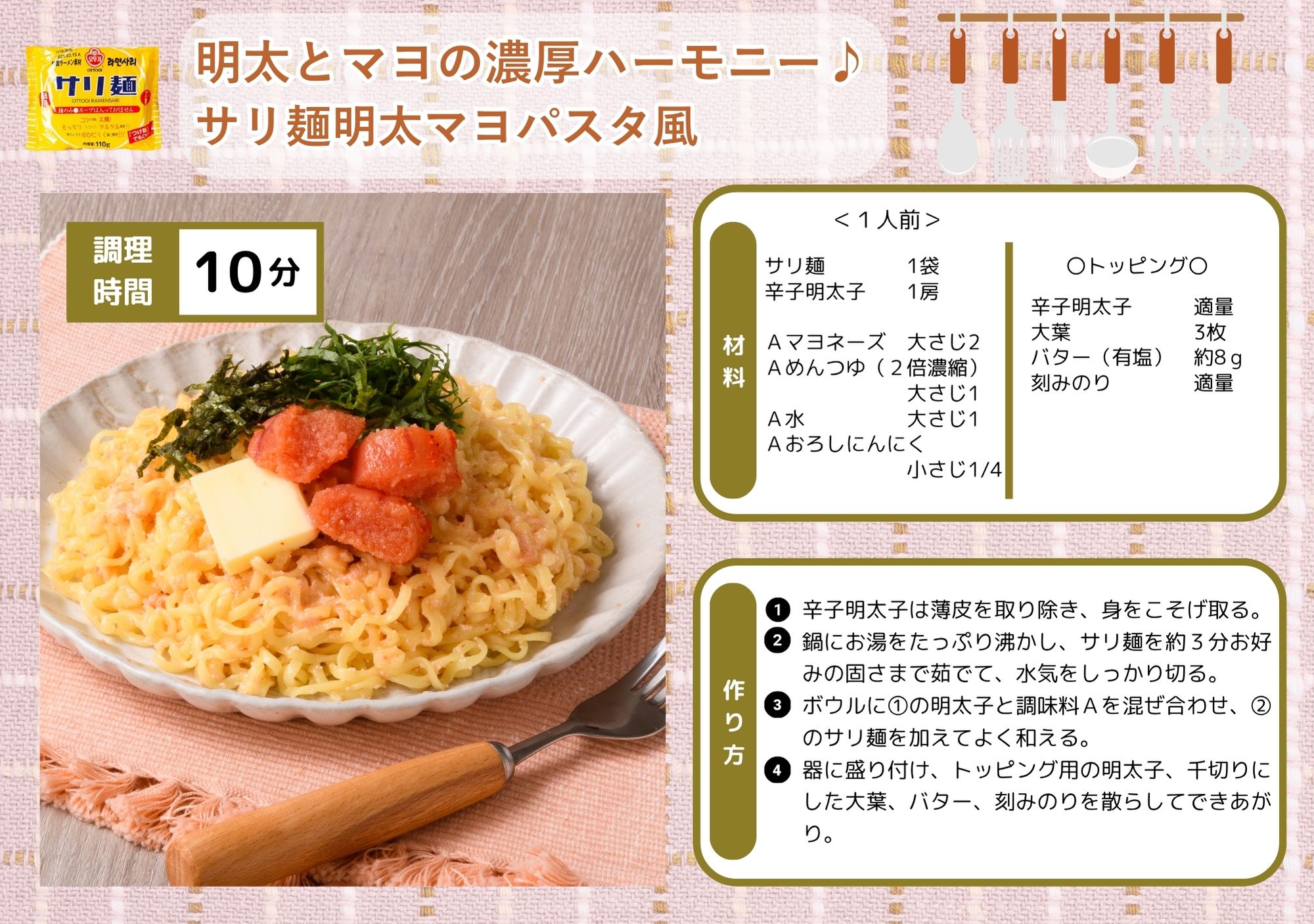 サリ麵明太マヨパスタ風 サリ麺に絡む、明太子とマヨの濃厚ハーモニーがたまらない。3ステップで完成。サリ麵で簡単パスタ風! レシピを印刷 調理時間 10 minutes mins合計時間 10 minutes mins コース サリ麺料理 Japanese 分量 1 人前 材料 サリ麺 - 1袋林商店の辛子明太子(なければ他でも可) - 1房調味料Aマヨネーズ - 大さじ2めんつゆ(2倍濃縮) - 大さじ1水 - 大さじ1おろしにんにく - 小さじ1/4トッピング林商店の辛子明太子(なければ他でも可) - 適量大葉 - 3枚バター(有塩) - 約8g刻みのり - 適量 作り方 辛子明太子は薄皮を取り除き、身をこそげ取る。鍋にお湯をたっぷり沸かし、サリ麺を約3分お好みの固さまで茹でて、水気をしっかり切る。ボウルに①の明太子と調味料Aを混ぜ合わせ、②のサリ麺を加えてよく和える。器に盛り付け、トッピング用の明太子、千切りにした大葉、バター、刻みのりを散らしてできあがり。 備考