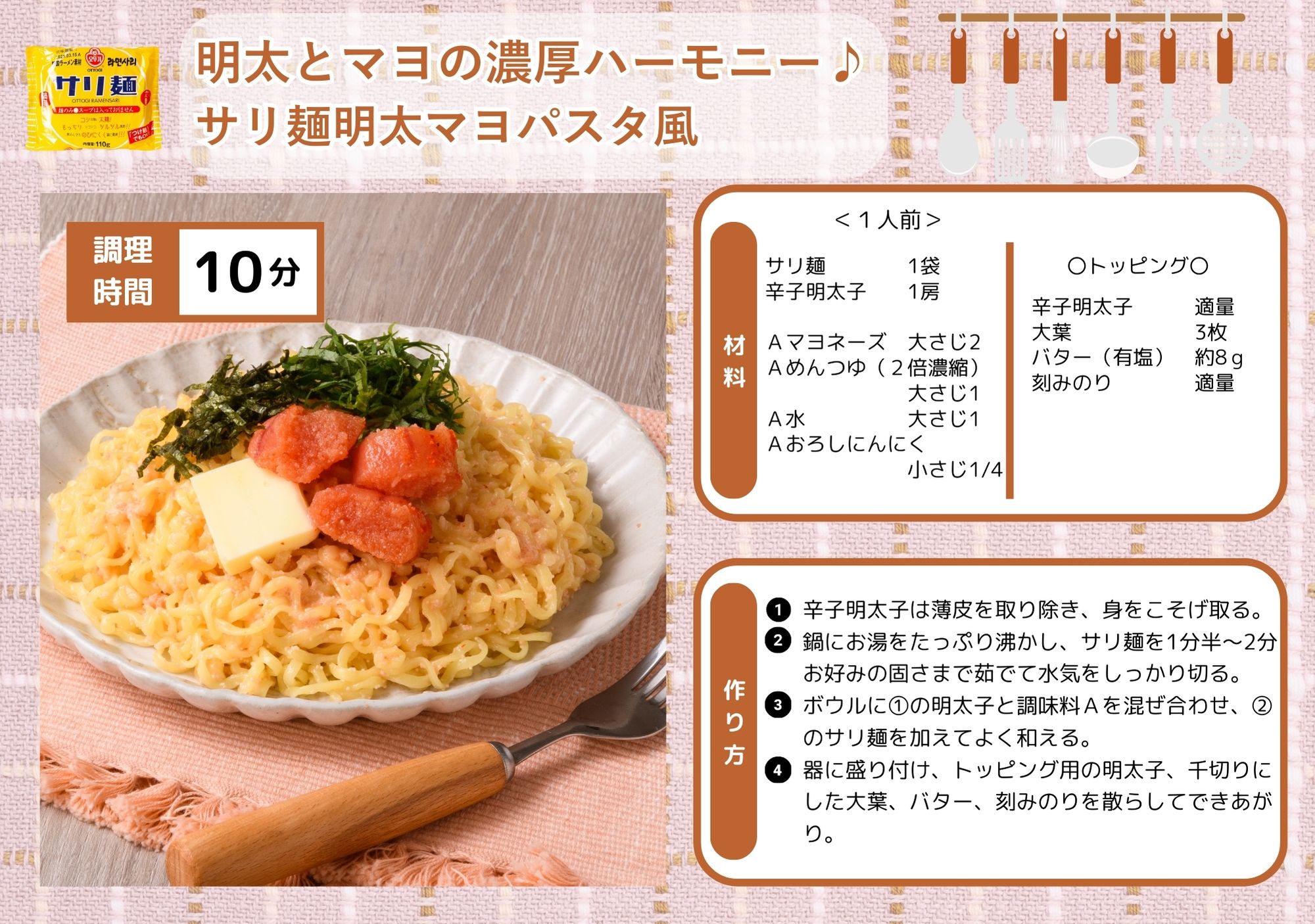 サリ麵明太マヨパスタ風 サリ麺に絡む、明太子とマヨの濃厚ハーモニーがたまらない。3ステップで完成。サリ麵で簡単パスタ風! レシピを印刷 調理時間 10 minutes mins合計時間 10 minutes mins コース サリ麺料理 Japanese 分量 1 人前 材料 サリ麺 - 1袋林商店の辛子明太子(なければ他でも可) - 1房調味料Aマヨネーズ - 大さじ2めんつゆ(2倍濃縮) - 大さじ1水 - 大さじ1おろしにんにく - 小さじ1/4トッピング林商店の辛子明太子(なければ他でも可) - 適量大葉 - 3枚バター(有塩) - 約8g刻みのり - 適量 作り方 辛子明太子は薄皮を取り除き、身をこそげ取る。鍋にお湯をたっぷり沸かし、サリ麺を1分半~2分、お好みの固さまで茹でて水気をしっかり切る。ボウルに①の明太子と調味料Aを混ぜ合わせ、②のサリ麺を加えてよく和える。器に盛り付け、トッピング用の明太子、千切りにした大葉、バター、刻みのりを散らしてできあがり。 備考